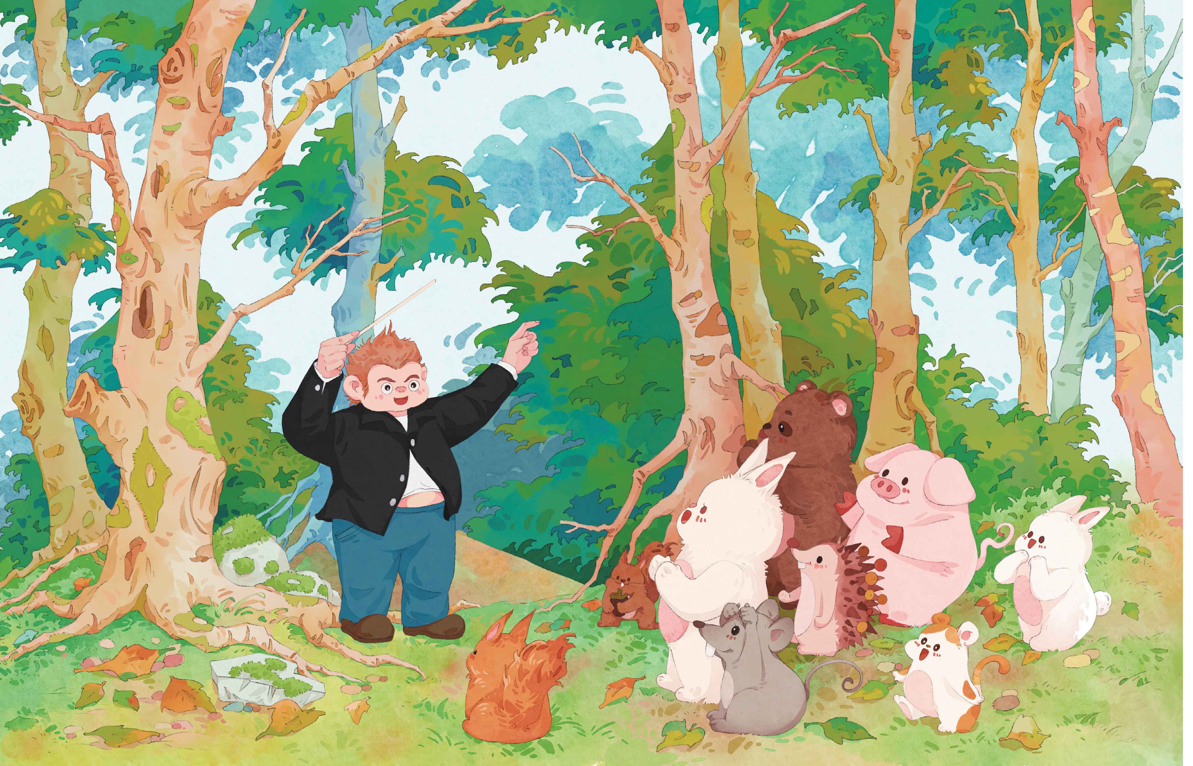大家唱得都很齐,唯有小耗子跟不上拍子,不是快,就是慢,惹得黑猩猩指挥很生气。
