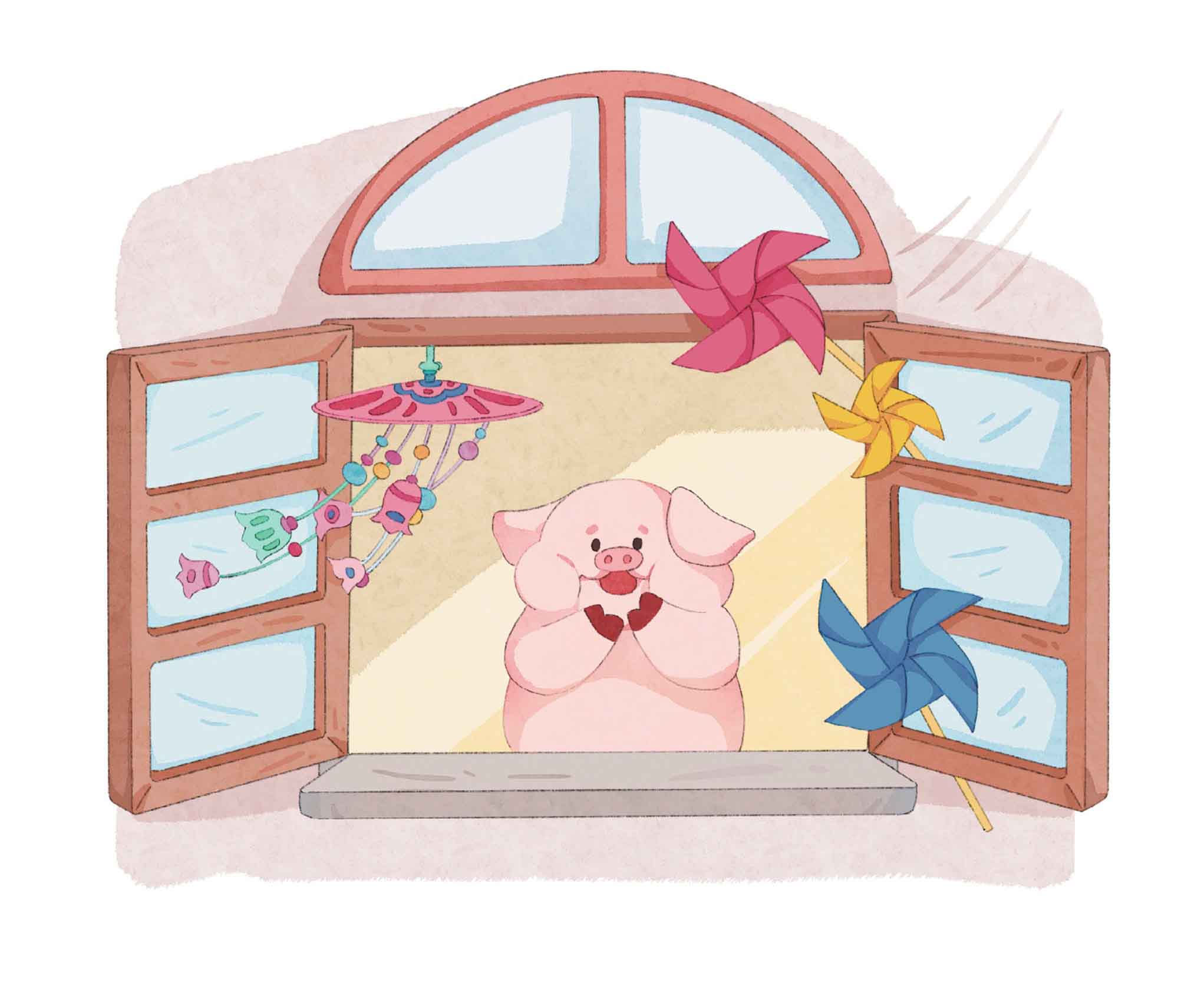 现在风儿天天带着花香、转着风车嗒啦嗒啦、摇着风铃丁零丁零来跟小胖猪波波玩儿,它的病全好啦!