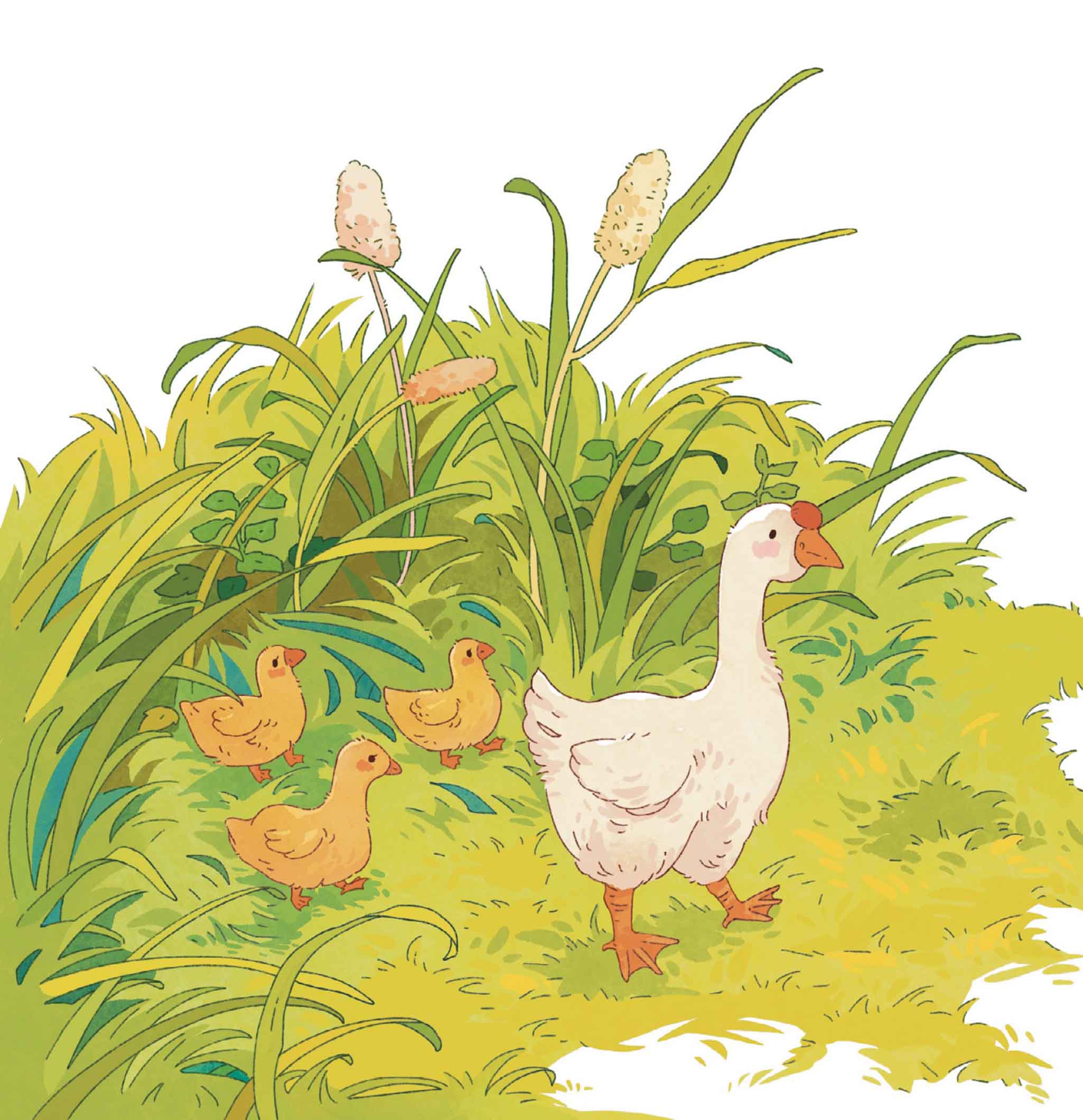 每天清晨,白鹅大婶就游过小河,向着河对岸的绿草地走去。