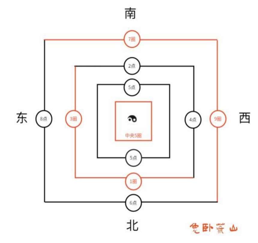 我们首先看到:位于《河图》(图一)中央的“5 圈”构图就是“东北西南中”五方、五宫的格局。五方、五宫不仅以“中”“中宫”占居C位,并且以“中”“中宫”到其它四方(东北西南)、四宫(东北西南)的距离相等而完成了太极四象的构建,以“中”为太极,太极外围不是“八卦”而是“四象”(东北西南)。