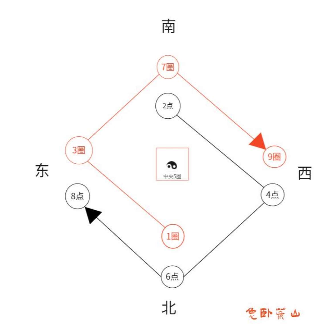 从图中(图四)可以看出四次方阵。第一次中央四象旗帜鲜明自我方阵(□);第二次中央 10 点分为北南(下上)各布5 点代表的方阵(□);第三次北 1 圈、西 4 点、南 2 点和东3 圈构成方阵(□);第四次北 6 点、西 9 圈、南 7 圈和东 8 点再次打造方阵(□)。