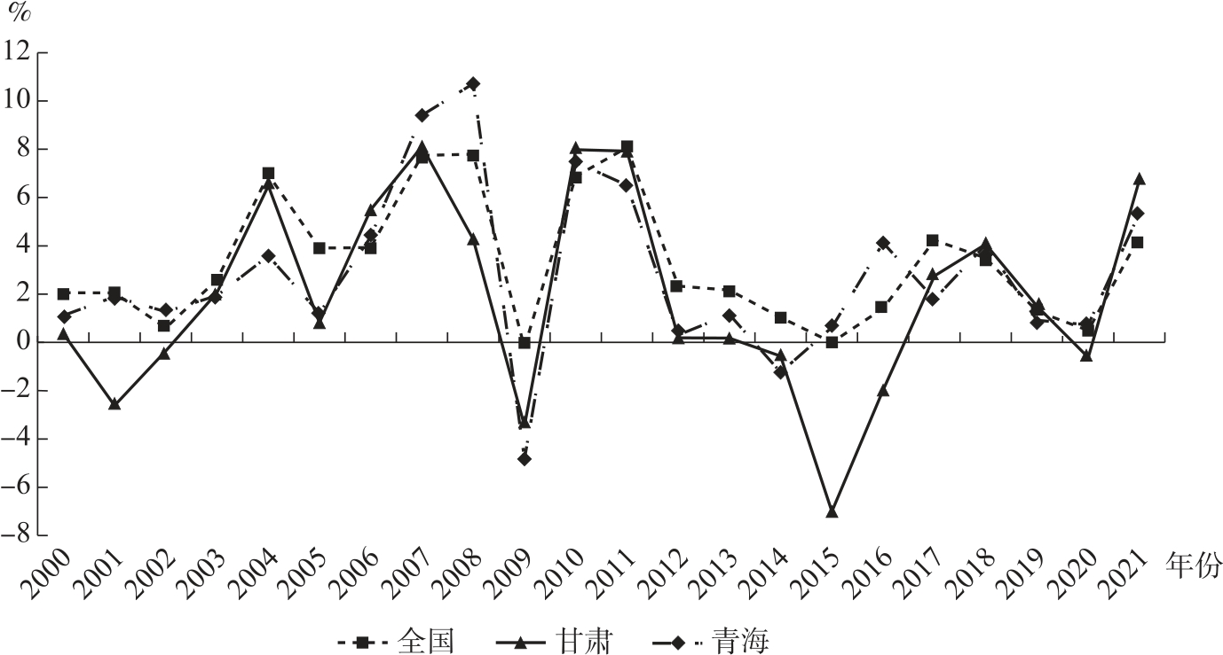 图1-4 2000—2021年全国与甘肃、青海两省的年通货膨胀率变化情况