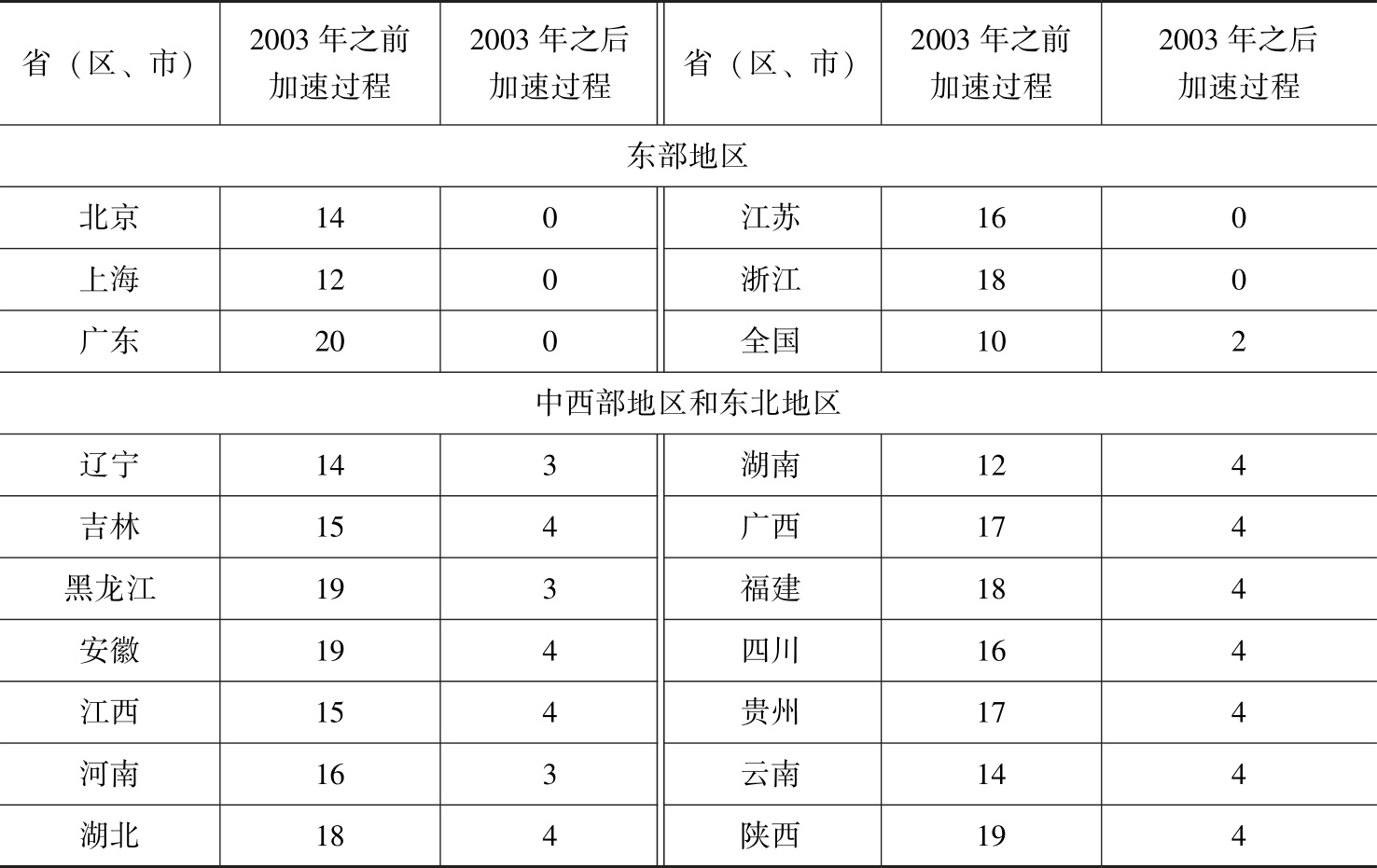 表2-3显示,整体上各个省(区、市)经济增长路径上都经历过频繁的加速过程,但是,2003年之后,我国经济增长加速过程发生区域转移。发达地区和沿海地区的增长加速期消失,经济增长趋于稳定,但是中西部省(区、市)依然处在持续增长加速阶段。
