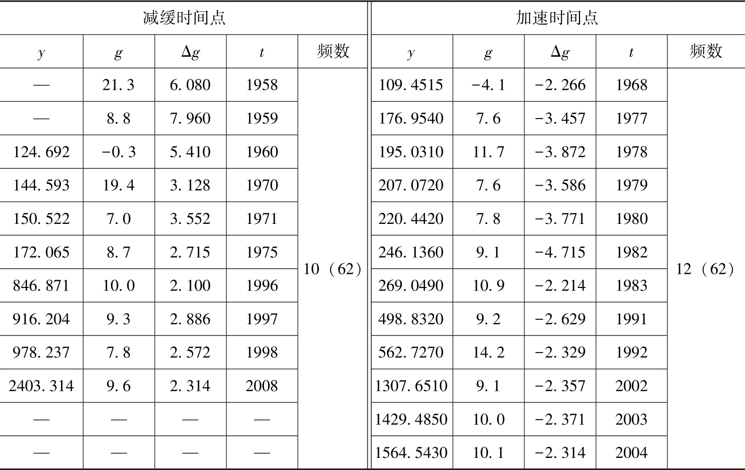 表2-2 1952—2013年经济增长发生二次拐点的时间长度及稳定性
