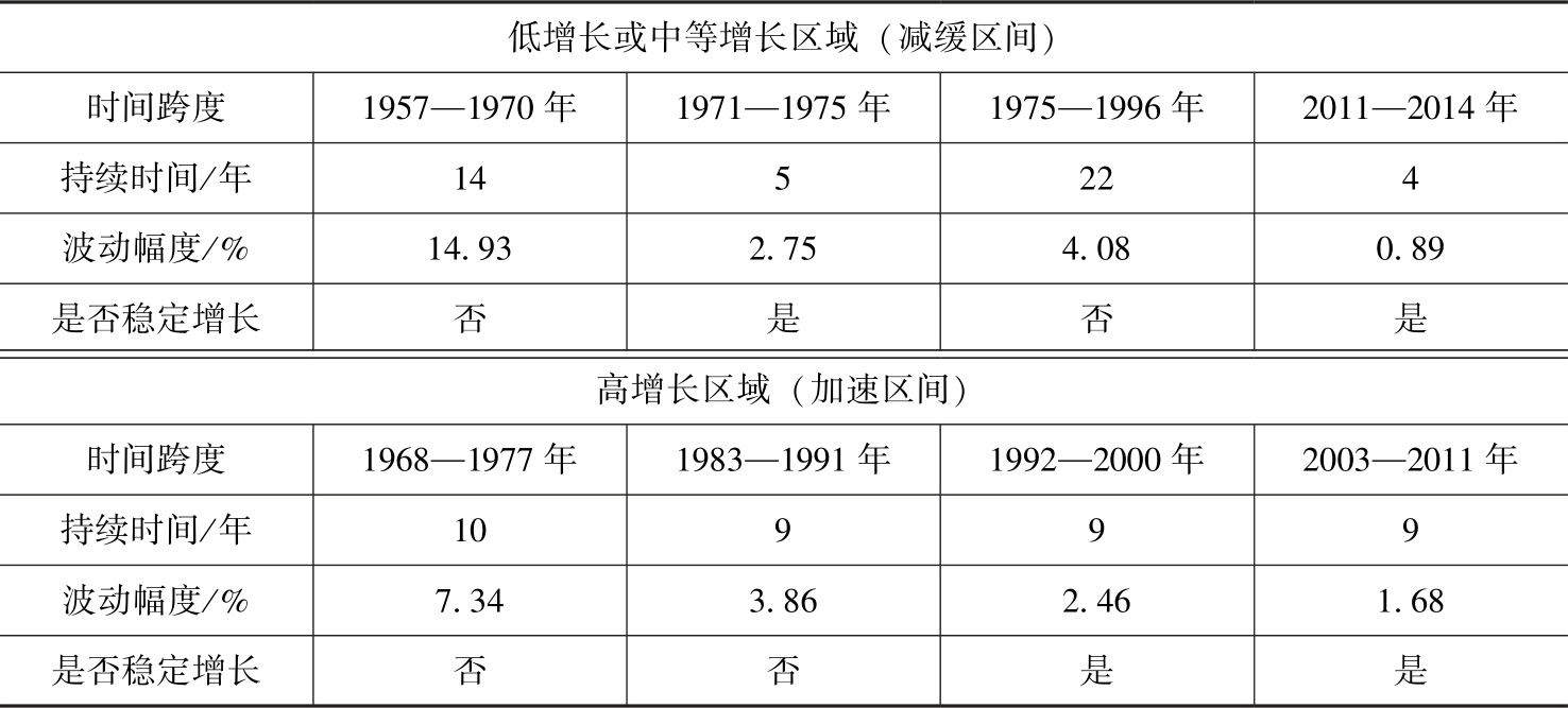 表2-2为1952—2013年我国经济增长路径高增长中的加速阶段和低增长(中等增长)中减缓阶段的特征数值。计算结果显示,1952—2013年,我国经历4次低增长或中等增长中的减缓阶段,分别为1957—1970年,持续时间为14年;1971—1975年,持续时间为5年;1975—1996年,持续时间为22年;2011—2014年,持续时间为4年。同时,中华人民共和国成立以后,我国经济增长经历4次高增长中的加速增长阶段,分别为1968—1977年,持续时间为10年;1983—1991年,持续时间为9年;1992—2000年,持续时间为9年;2003—2011年,持续时间为9年。根据稳定增长的界定,在经济减缓区间中,经济增长波动幅度小于3%的只有2次,分别为1971—1975年和2011—2014年。这2次经济增长减缓属于稳定增长的界定范围,其中1975—1996年属于低增长稳定状态,2011—2014年属于中等增长稳定状态。同时,在经济加速区间中,经济增长波动幅度小于3%的也有2次,分别为1992—2000年和2003—2011年,它们都属于经济高增长稳定状态,其中2003—2011年的增长稳定性更为明显。