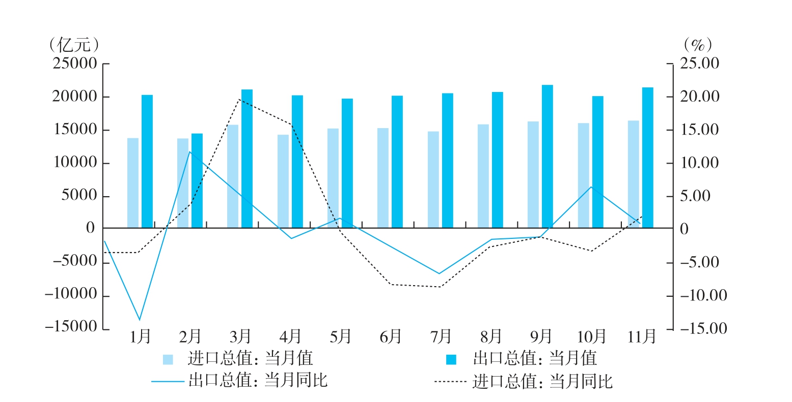 海关总署公布的进出口数据显示,以人民币计价,1—11月,我国进出口总值为37.96万亿元人民币,与上年同期(下同)持平。其中,出口21.6万亿元,增长0.3%;进口16.36万亿元,下降0.5%;贸易顺差5.24万亿元,扩大2.8%。以美元计价,前11个月,我国进出口总值为5.41万亿美元,下降5.6%。其中,出口3.08万亿美元,下降5.2%;进口2.33万亿美元,下降6%;贸易顺差7481.3亿美元,收窄2.7%。如图1-2所示。