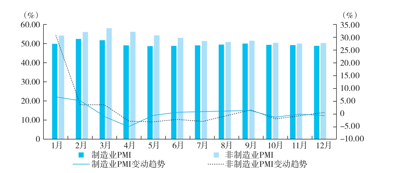 图1-4 2023年1—12月中国制造业PMI、非制造业PMI及变动趋势