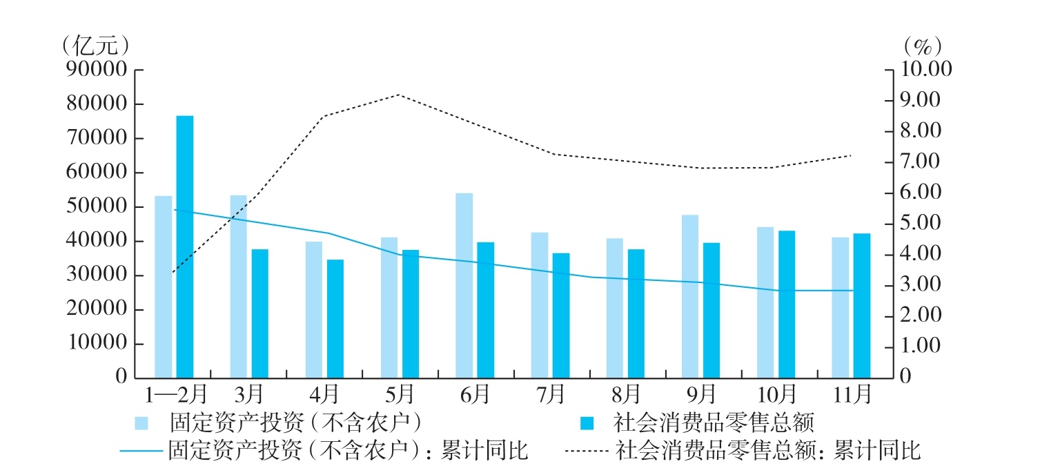 图1-1 2023年1—11月固定资产投资与社会消费品零售总额当月值及累计增速变化情况