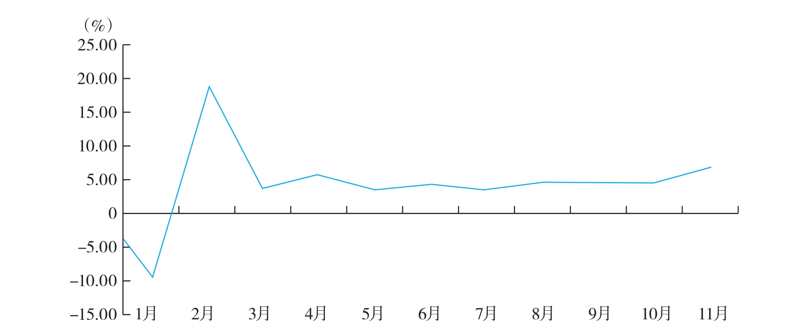 与当期需求不足并存,产能过剩矛盾更为突出。国家统计局数据显示,1—11月,全国规模以上工业增加值同比增长4.3%,比1—10月加快0.2个百分点。11月,规模以上工业增加值同比实际增长6.6%,创下年内最高点。从环比看,11月,规模以上工业增加值比上月增长0.87%。如图1-3所示。工信部部长金壮龙预计全年工业增加值同比增长4.3%以上。