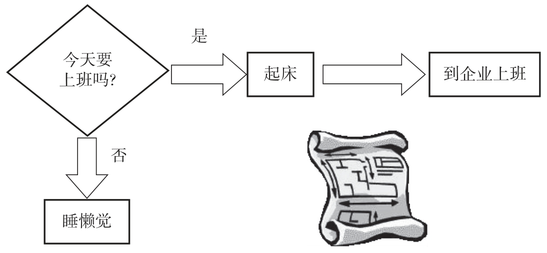 做任何事情从开始到结果都有一个流程,图4.1是一个早晨上班的流程。由此可以看出,流程就是把要做的事情按顺序用箭头连起来。