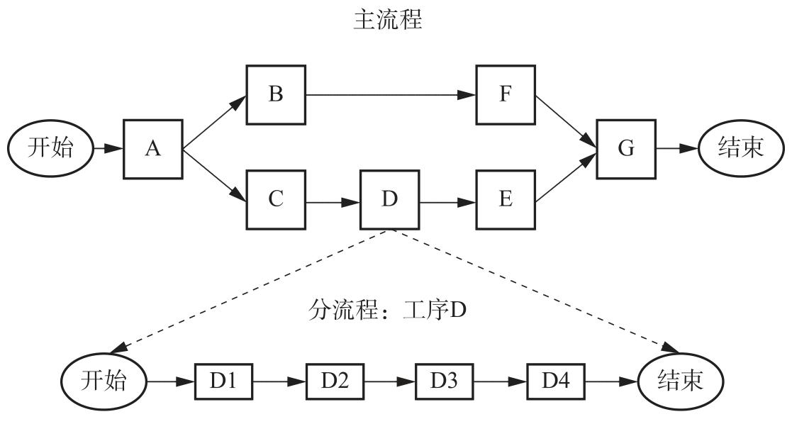 在复杂的流程中,可以采用分流程和层叠结构来逐步展开更加细化的工序流程。一般说来,工序本身可以细分为更小的工序,该工序也可以看作一个流程,这时我们可以把它看作原流程的分流程。