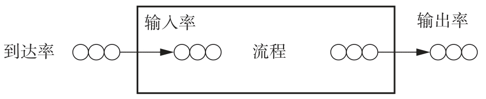 从外界可能有多个进入流程的输入,也可能有多个离开流程的输出。我们把单位时间内所有进入流程的流动单元数称为输入率,把单位时间内所有从流程离开的流动单元数称作输出率。这里需要注意的是,我们认为进入流程的流动单元总会离开流程,所以总输出等于总输入,而对于输入、输出而言,总处理时间是相同的,即输出率等于输入率。进入流程的流动单元没有离开流程,永远留在流程内部,这样的流程是不存在的。这就好比一个人去医院看病,他进去了却没有出来,这是不可能的,不管以何种方式,他都会离开医院。同样,零部件或原材料进入工厂,最终会以产品的形式离开流程,当然也可能以废物的形式离开流程。总之,进入流程的流动单元必定会离开流程,所以流程的输出率等于输入率。那么流程的输出率取决于什么呢?有两种情况:一种是流动单元的到达率小于整个流程的转换速率,因为到达的所有流动单元都可以进入流程,所以输入率就等于外部的到达率,因而也小于流程的转换速率。因为输出率等于输入率,所以输出率也小于流程的转换速率。另一种是外部到达率大于整个流程的转换速率,就不能保证外部到达的所有流动单元都进入流程,这是因为如果流动单元都进入流程,输入率将大于流程的转换速率,流动单元会越积越多,以至于无穷,而流程缓冲区的产能是有限的,只能容纳有限数量的流动单元。因为只有部分流动单元进入流程,所以输入率小于外部到达率;因为进入流程的流动单元必然会离开流程,所以输出率等于输入率。总之,输入率和输出率小于等于到达率,图4.7和图4.8分别展示了到达率大于输入率和到达率等于输入率的两种情况。