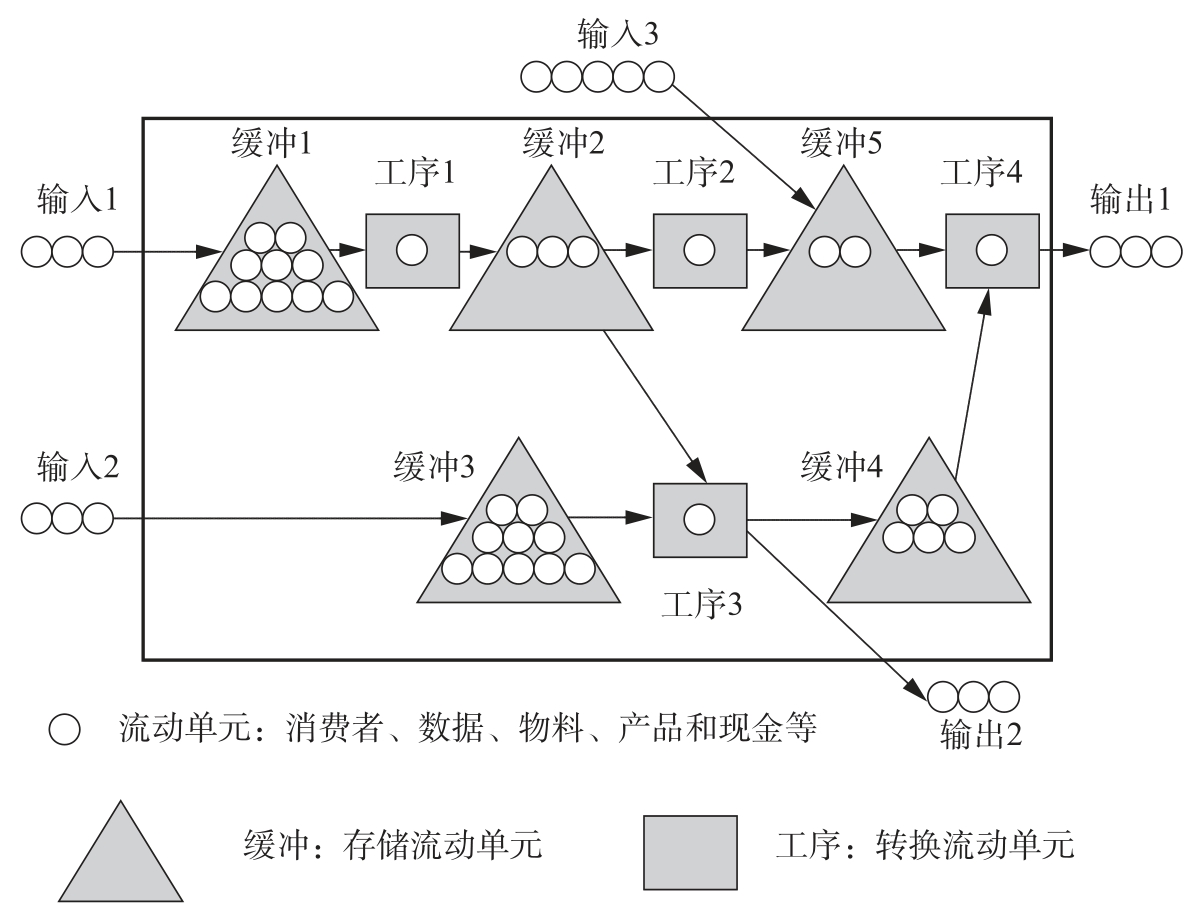 对于一项流程来说,识别其输入和输出很重要,因为通过识别输入和输出,我们可以把流程和外部环境分开,这样便于分析流程。图4.6中方框所包含的范围就是我们要考虑的流程,其包含了4道工序和5个缓冲。在图4.6中,共有3个输入和2个输出。