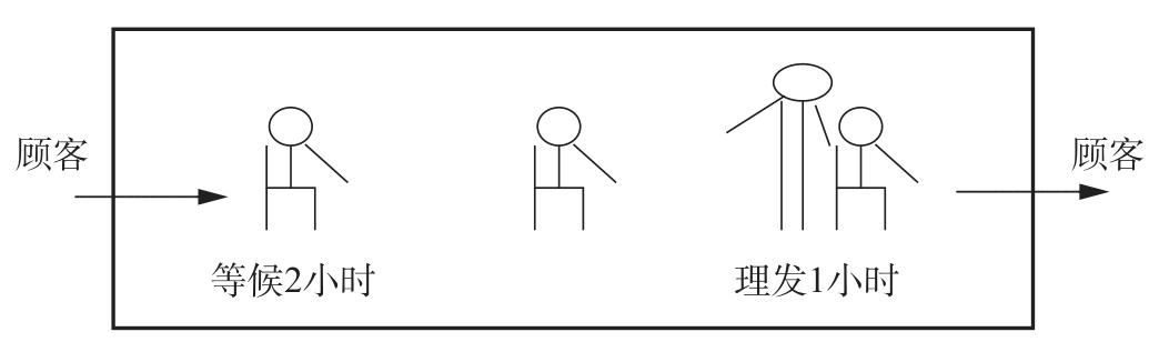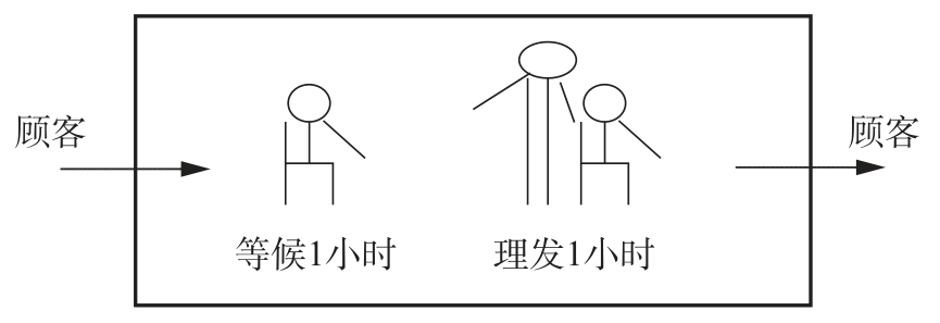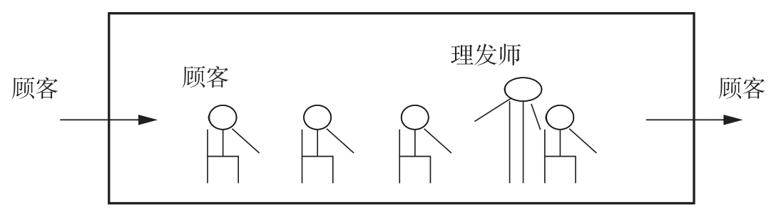 让我们想象一下理发店的情况。我们设置这样一个理发店:只有一位理发师,为了方便,假定他理发的速度是每小时1人。理发店还需要放置让顾客等候的座椅。理发店流程如图5.1所示。