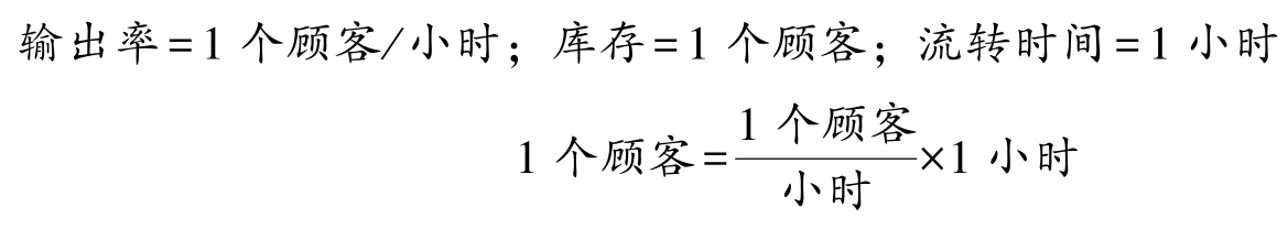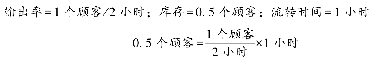 我们假设顾客到达的速度和理发师理发的速度一样,每隔1小时来1个顾客。所以输入率是每小时1个顾客。由于顾客到达的速度和理发师理发的速度一样,所以理发店永远只有1个顾客在理发,流程的库存是1个顾客。顾客经历1小时理完发离开,所以流转时间是1小时。1小时从理发店出去1个顾客,所以输出率是每小时1个顾客。