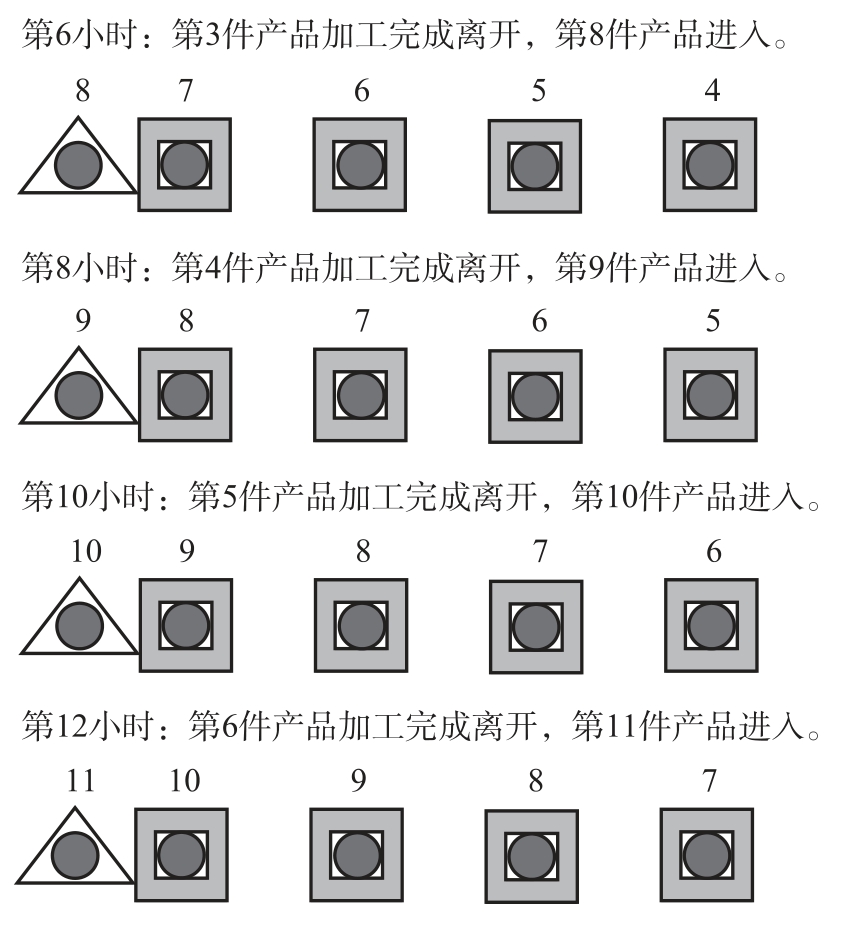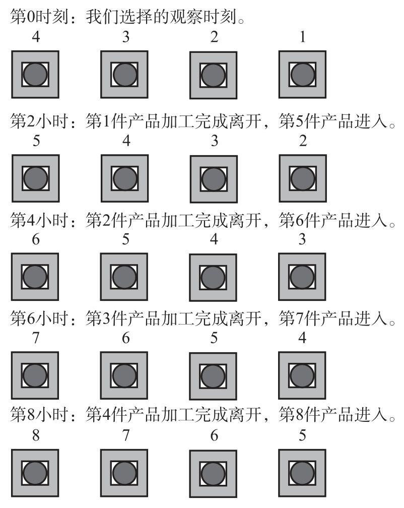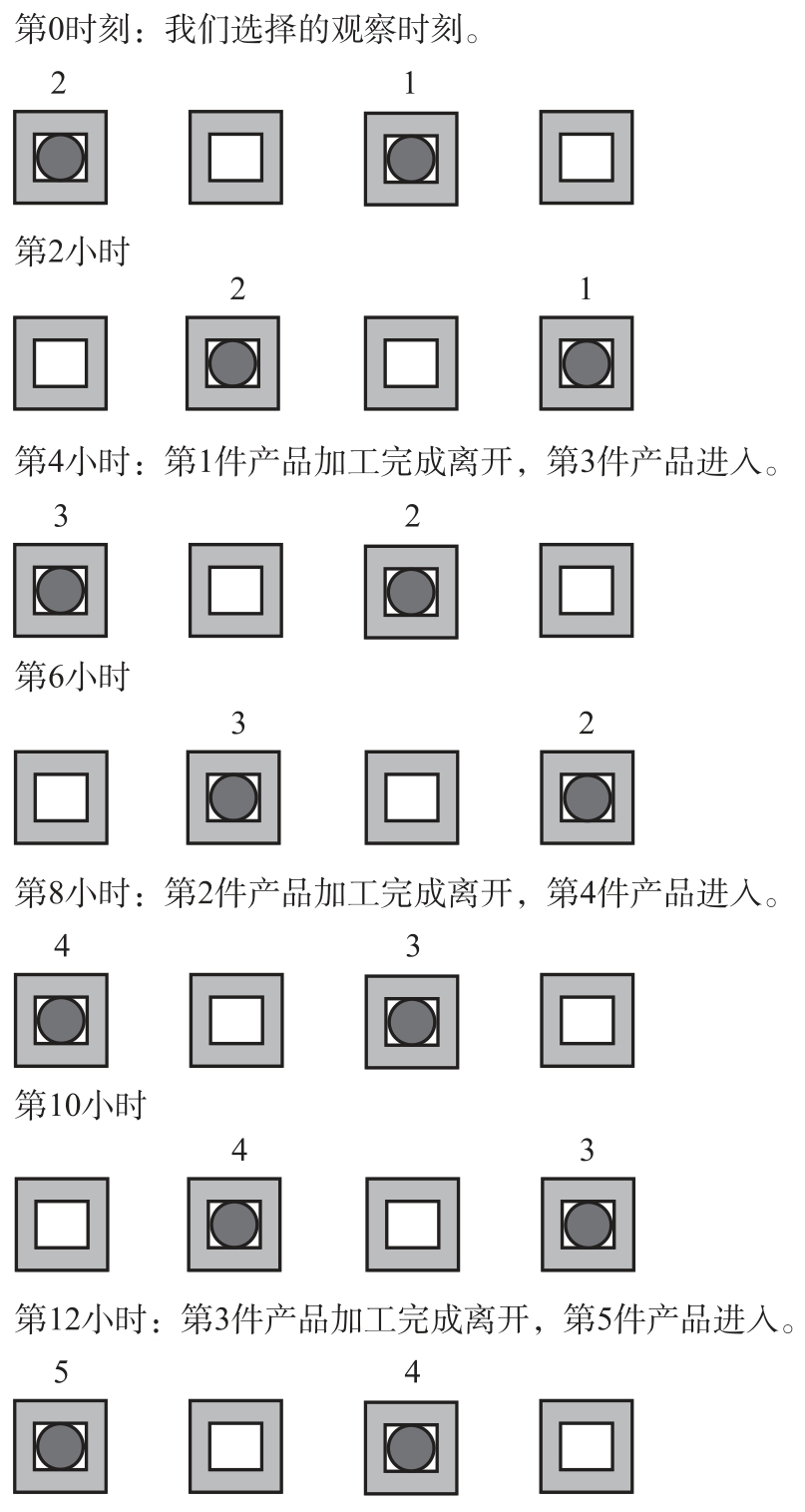 我们观察到,第1件产品离开时刻和第2件产品离开时刻间隔4小时,第2件产品离开时刻和第3件产品离开时刻也是间隔4小时。因此,产出速度就是每4小时产出1件产品,每件产品在工厂中经历的时间是8小时,工厂中任何时刻都有2件产品在流程中。