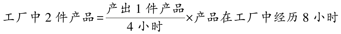 我们观察到,第1件产品离开时刻和第2件产品离开时刻间隔2小时,第2件产品离开时刻和第3件产品离开时刻也是间隔2小时。因此,产出速度就是每2小时产出1件产品,每件产品在工厂中经历的时间是8小时,工厂中任何时刻都有4件产品在流程中。
