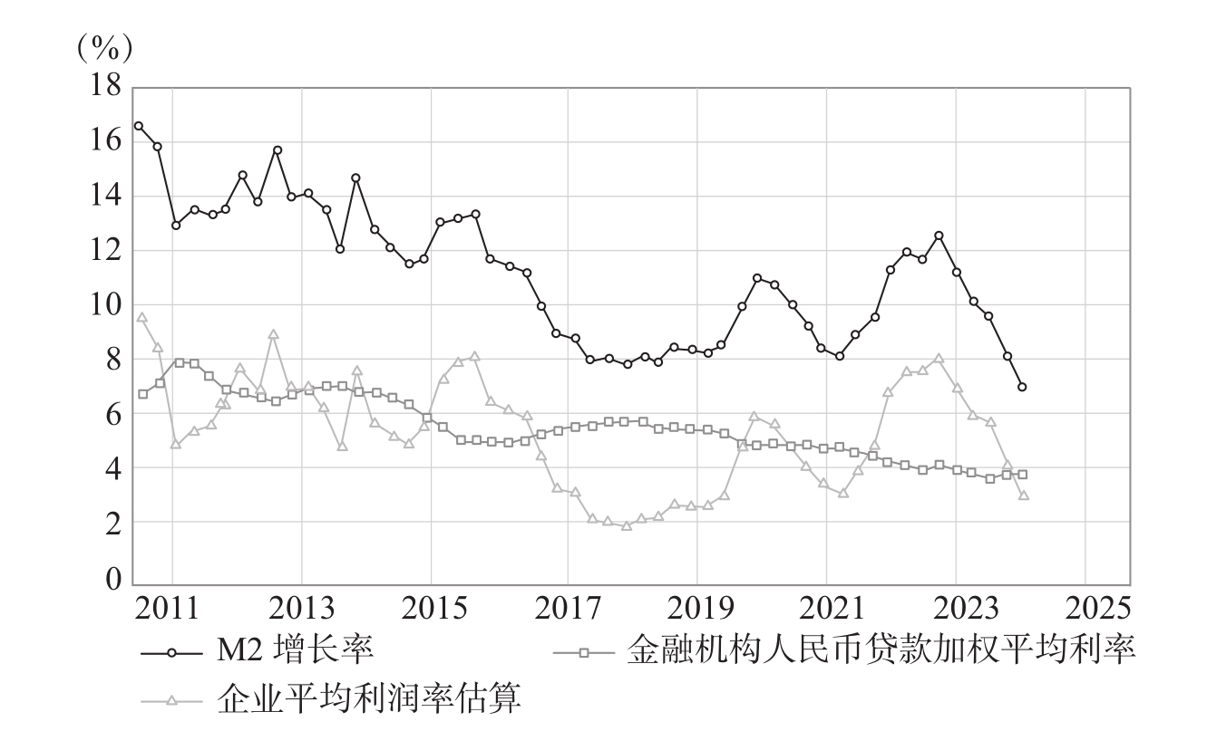 企业是否盈利是宏观经济分析的核心问题。在第四章,我们指出企业当前投资生产的前提是预期未来会有利润,而未来利润又取决于当前名义GDP的增长,所以只有预期到未来有利润且当前名义GDP有增长时,企业当前的投资行为才会发生。这样,利润率或利润就把经济增长和投资波动联系起来,进而资产价格也会表现出周期波动特征。前面分析到,利润率近似为货币增长率与利息率之差。现实中,通过考察货币供应量M2增长率和金融机构贷款加权平均利率,可以估算出企业的平均利润率水平。如图2-4所示,截至2024年7月,我国M2增长率在6.2%左右,金融机构人民币贷款加权平均利率在3.7%附近,两者相减,企业平均利润率在2.5%左右。