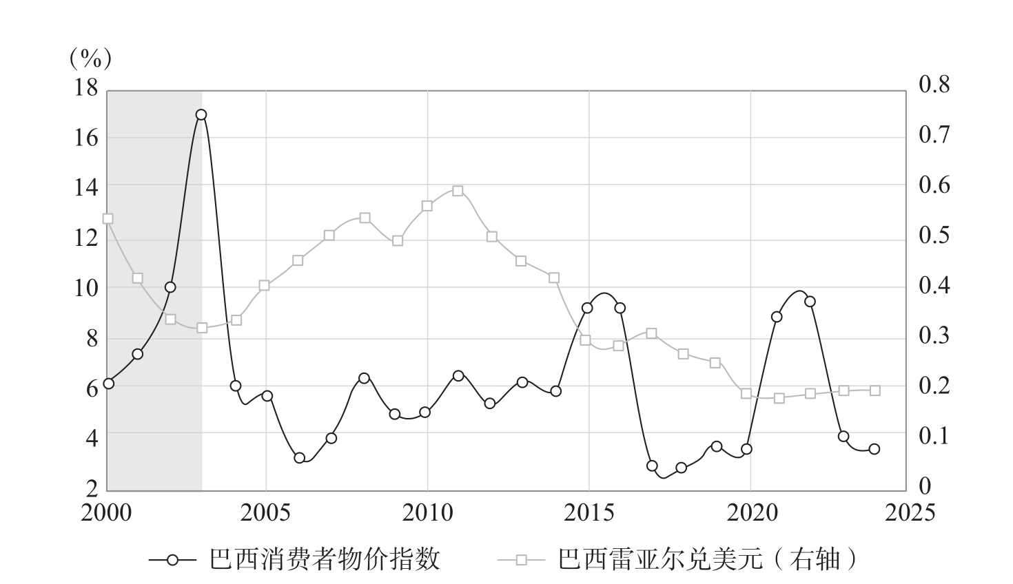 通胀性萧条。上文中我们讨论了通胀性繁荣,揭示通胀更多的是由内在经济增长驱动的,同时兼具需求拉动和成本推动的特征。然而,并非所有的通胀都是好的,也有坏的时候。瑞·达利欧在《债务危机》一书中对27个最严重的通胀性债务周期案例进行了深入分析,指出具有以下特点的国家或地区更有可能出现通胀性萧条:一是本国货币不具有国际储备货币的地位,因此全球其他国家并不会持有该国货币或债务。二是外汇储备较少,难以有效抵御资本外流的冲击。三是外债规模较大,对于借入强势外币的债务人而言,本币贬值将会导致债务成本的飙升。四是财政预算赤字或经常账户赤字规模庞大且不断增加,不得不依赖发债或印钞弥补。五是实际利率为负,即利息率远低于通胀率,无法为持有资金或债务的贷款人提供足够补偿。六是有过高通胀、货币总回报率为负的历史,导致人们对该国货币、债务价值的信任度较低。当具有上述特点的国家出现政治动荡或经济下行时,资本外流和汇率大幅贬值将不可避免地带来通胀性萧条问题。最具代表性的案例是20世纪80年代以来的拉美国家,以及更早时期的魏玛共和国。图2-7展示了巴西消费者物价指数和汇率走势情况。
