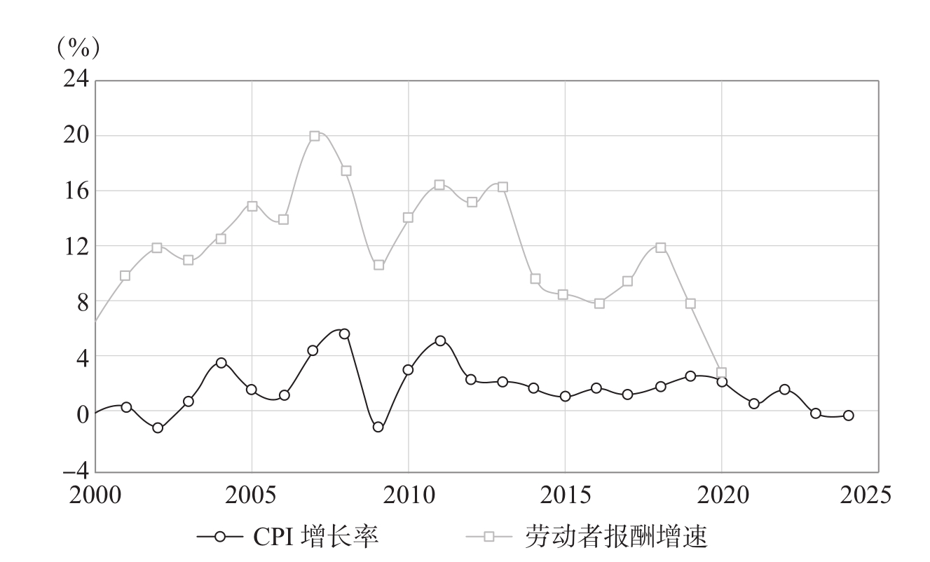 CPI反映的是基本消费品价格的变动。在第九章,我们指出CPI主要受工资、资产价值、投资三条渠道的影响。工资作为决定CPI走势的关键变量(见图2-8),其影响主要体现在两个层面。一是从需求层面拉动基本消费品增长,二是从成本层面支撑基本消费品价格。资本存量价值的变动也将影响整个社会的运行成本。如在经济周期扩张阶段,随着土地、房地产等资本存量价值的快速上升,整个经济社会租金成本将大幅上涨,在成本的推动下,CPI保持上行趋势,尤其是在经济繁荣阶段,房地产、股市等虚拟经济收益率往往高于实体经济,导致资产价值更快速上升。资产价值的大幅上升必然会再次抬高折旧、利息以及企业总体运行成本,使CPI上涨表现出明显的资本推动型特征。固定资产投资的变动也是影响CPI的重要因素。投资增加会带动生产资料价格上涨,而生产资料价格上涨又会通过产品成本传导至终端的CPI。在分析CPI走势时,我们还需特别关注重要民生商品的价格波动。例如,粮油肉蛋菜奶果等食品类商品价格,尤其是猪肉价格的波动,对整体CPI的影响比较显著。这主要是因为食品烟酒项在CPI中的权重较大,接近30%,而且波幅比较大。