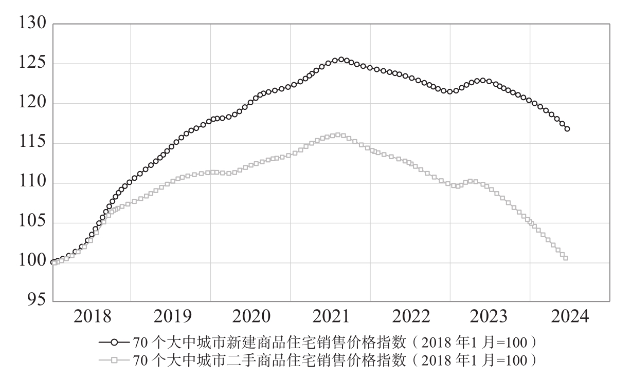 房地产是重要的抵押资产。当货币的创造依赖于抵押资产,尤其是房地产和土地时,房地产市场的波动便会自然而然地成为货币创造议题。柳欣教授研究发现,美国总资本中65%左右是地产,而且这个比例在长期一直保持稳定。这就意味着,由投资所转化的资本增加或资本积累主要是地产的增值或地价上升。也就是说,资本只是那块地,资本积累只是人们用更高的价钱去买(投资)那块地。前面我们分析到,货币创造的本身就是债务积累的过程,这一过程的深化与拓展则高度依赖于房地产与土地等优质抵押物的价值。同时,货币创造和流动的过程不仅是经济增长的过程,也是收入增长和分配的过程。因此,房地产价格、货币创造、债务问题、经济增长、居民收入之间是紧密相连的。由此可见,房地产问题远非单一的民生保障问题,它是市场经济中在货币基础上的竞争的重要组成部分。我国住宅销售价格指数走势情况如图2-15所示。