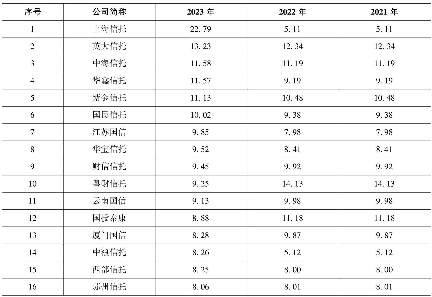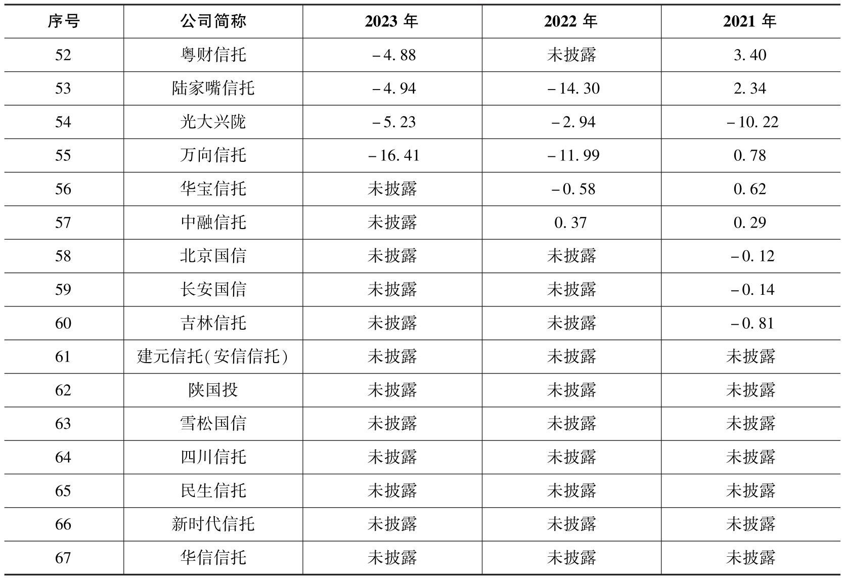 从本书截至2024年6月25日(以下统计时间口径相同)获得的2023年的年报披露情况来看,除北京国信、中融信托、长安国信、雪松国信、四川信托、新时代信托、华信信托和民生信托以外,其余59家公司均披露了资本利润率这一指标。