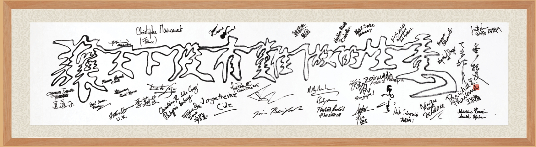 2015年,为天猫双11购物节启动书写连笔空心字:“让天下没有难做的生意”,全球39个国家驻华使节以及马云先生在该作品上签名。
