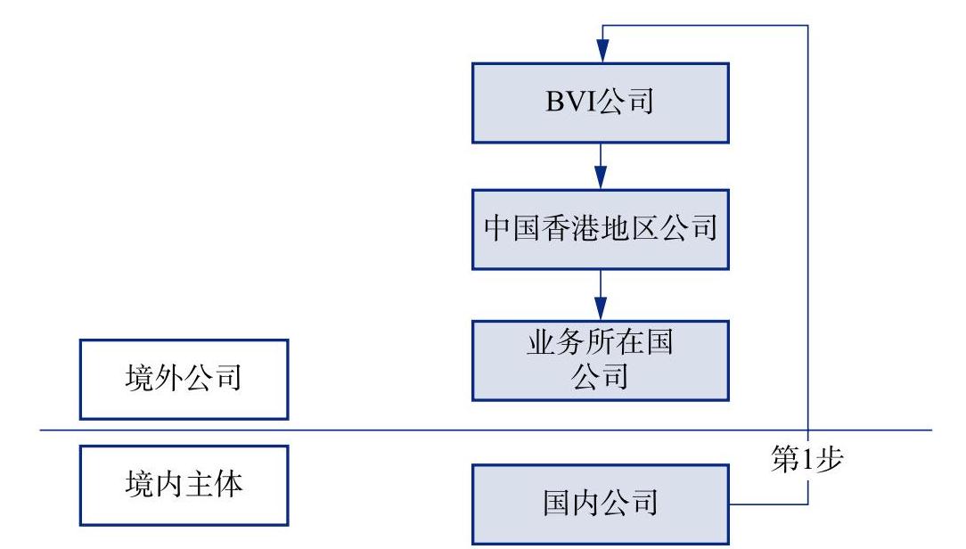 这种模型适用于出海企业(国内公司到境外拓展业务)使用,简称对外直接投资(Outbound Direct Investment,ODI),见图2-4-5。通常做法是:用国内公司主体在英属维尔京群岛(BVI)成立公司,然后由BVI所在公司控股中国香港地区公司,再由中国香港地区公司投资控股业务所在国公司。这样设计的好处是境外各主体的利润分红最后可以合法回到境内主体。