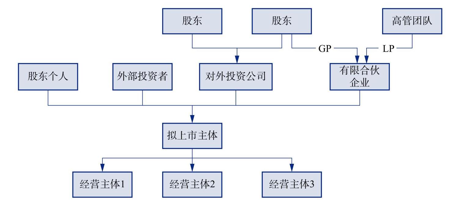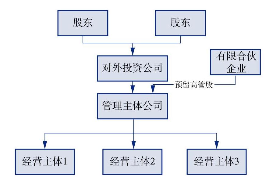 这种模型适用于大部分企业,上层是创始股东和对外投资主体,中间是经营的管理平台,下层是实际经营实体,见图2-4-1。