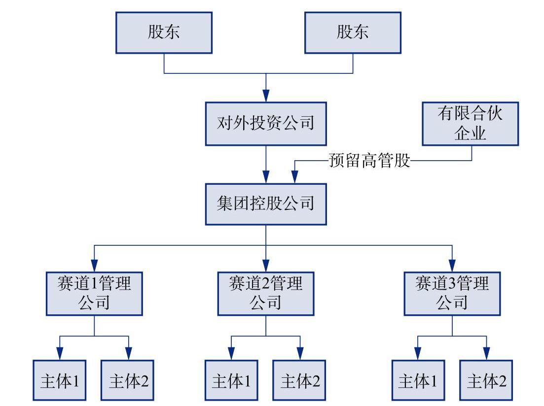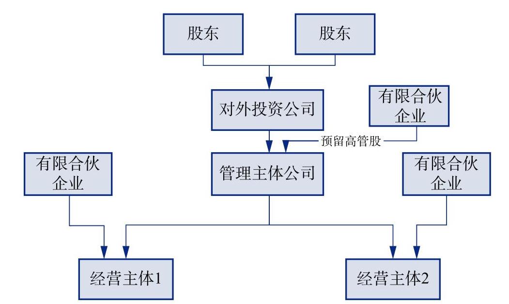 多产业赛道的集团模式。在集团层、管理公司层、经营层都可以设置有限合伙企业作为高管激励平台,根据经营所需而定,见图2-4-4。
