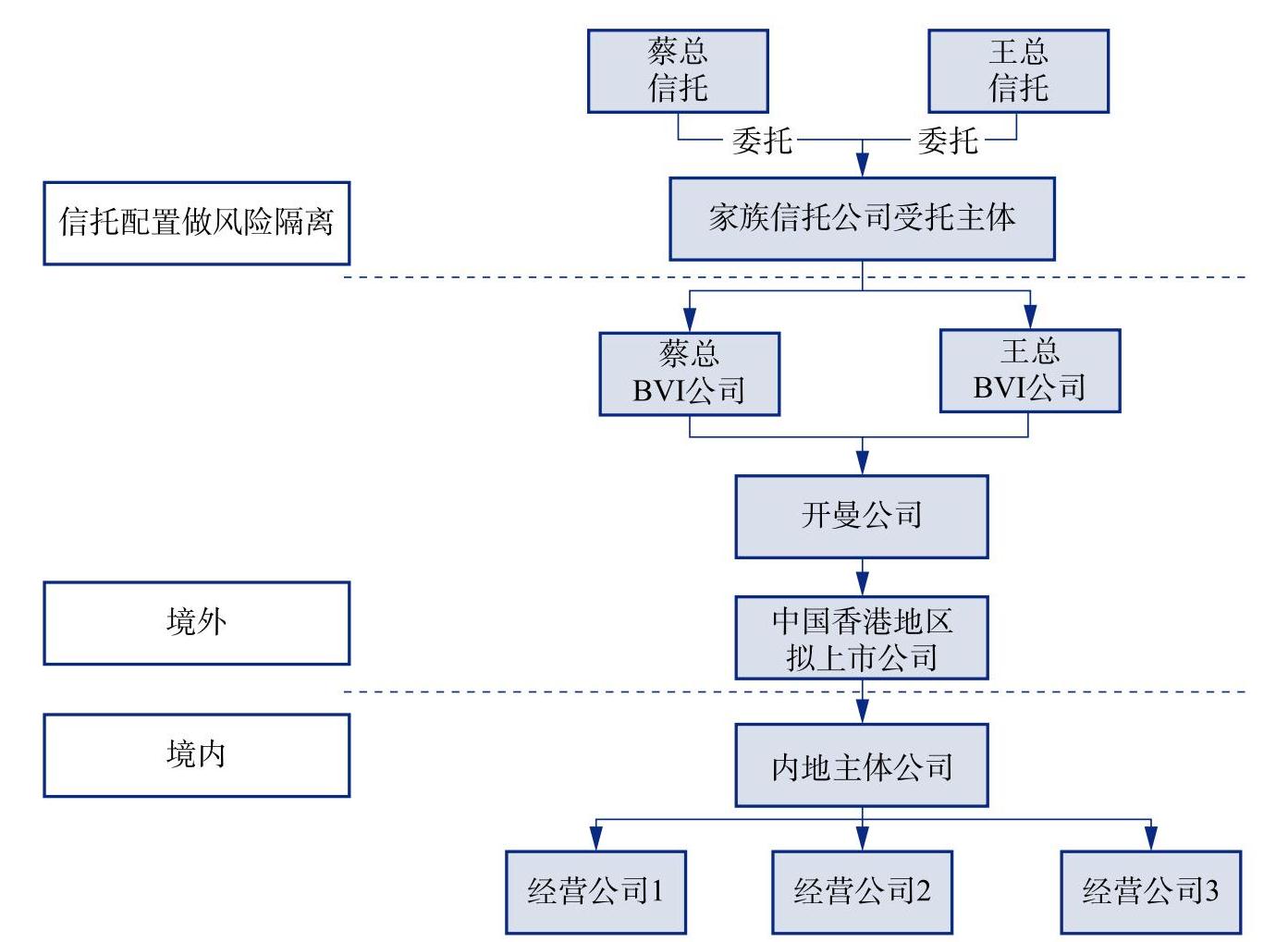 首先成立王总与蔡总各自的家族信托并确定信托公司受托主体。分开设立信托的好处是可以防范后续因为婚姻变动在做股权分割时可能带来的高额税收成本,同时也规避了对上市公司的后续影响。