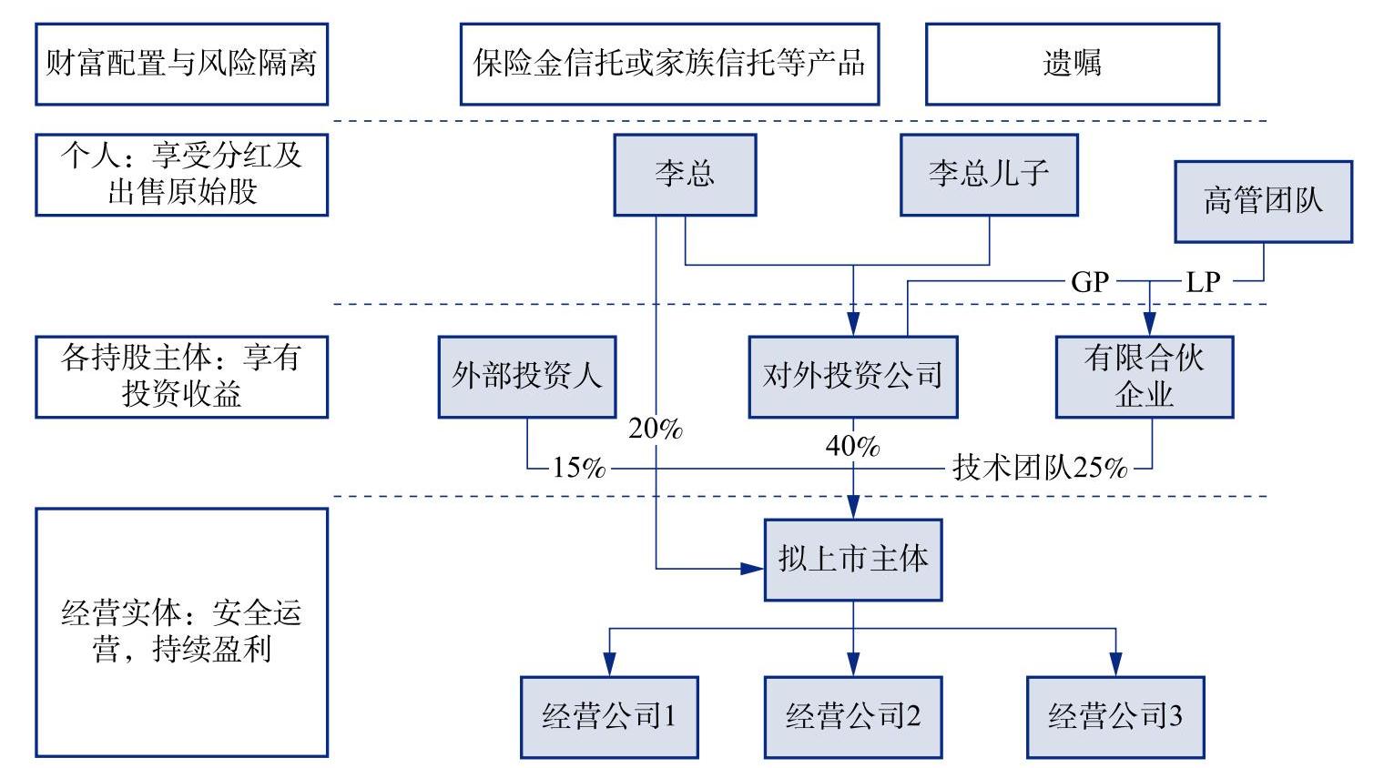 李总需求:希望以上市公司为目标设计股权架构,同时做好他个人与公司的风险隔离,制订个人财富规划(最好能用到杠杆),考虑二代安全传承财富。