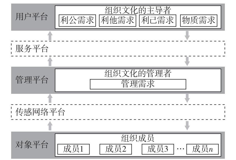 组织文化是人群的共同需求随着发展阶段的推进、环境的变化而改变,所形成的体系化更强、形式更多样、对组织内人群约束力更强的文化。组织文化物联网的结构如图5所示,拥有组织发展所需资源、提出主导性需求的人员或机构形成该文化物联网的用户平台(称作“组织文化的主导者”),由用户平台授权对文化进行管理的主体(称作“组织文化的管理者”)形成管理平台,受到文化影响的组织成员形成对象平台。