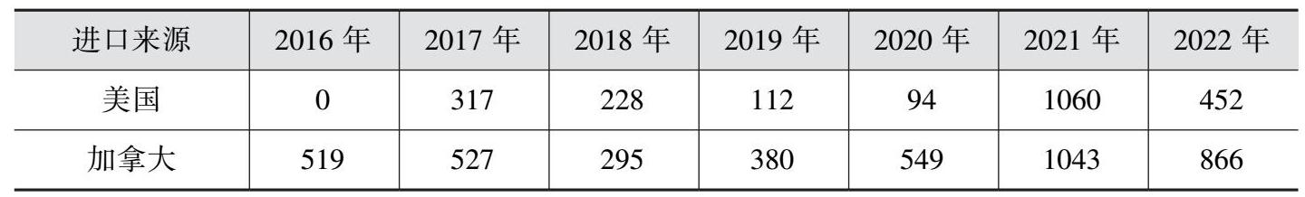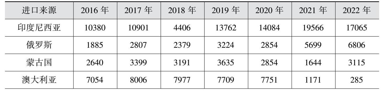 表1-2 2016—2022年我国煤炭进口来源基本情况 单位:万吨