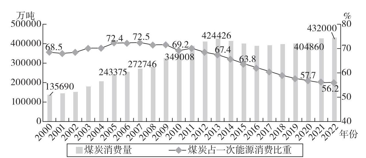 图1-1 2000—2022年我国煤炭消费量和一次能源消费占比情况