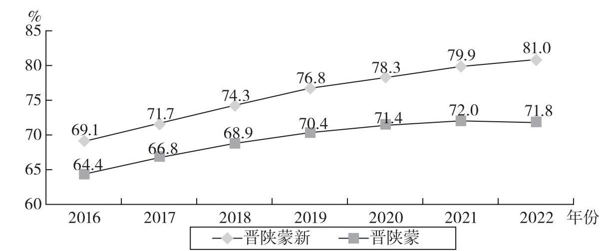 图1-2 2016—2022年我国晋陕蒙新及晋陕蒙煤炭产量占全国比重