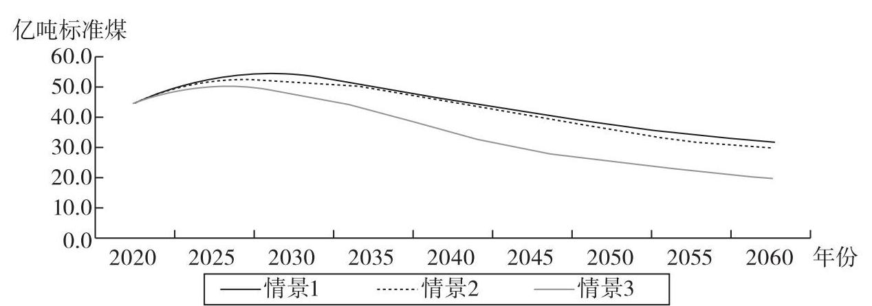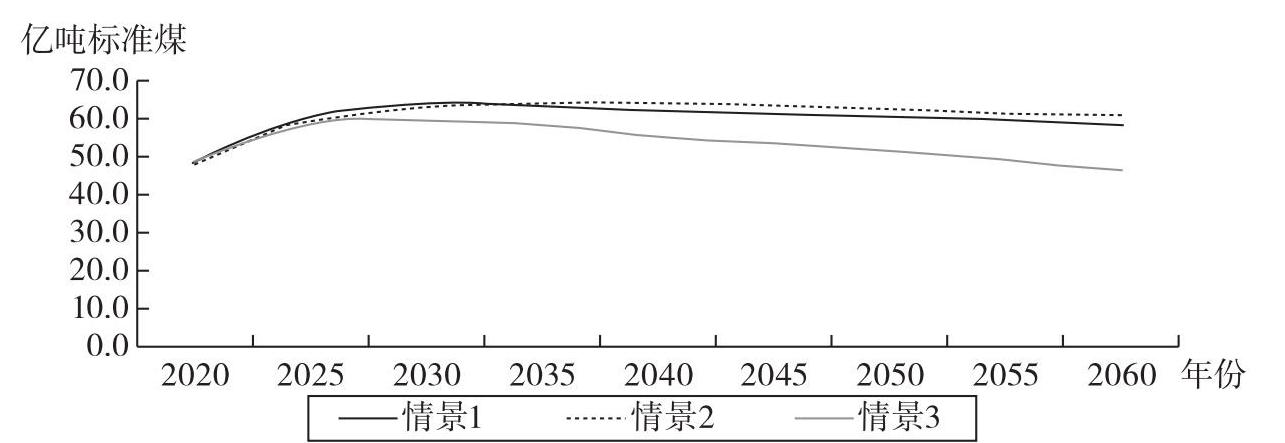 从中长期看,3种情景中能源消费总量峰值集中在2025—2035年出现。以发电煤耗法计算,能源消费总量峰值水平为59.5亿~63.5亿吨标准煤;以电热当量法计算,能源消费总量峰值水平为50.7亿~54.1亿吨标准煤。两种计算方法的结果出现较大差异,主要原因是能源消费结构发生颠覆性改变。