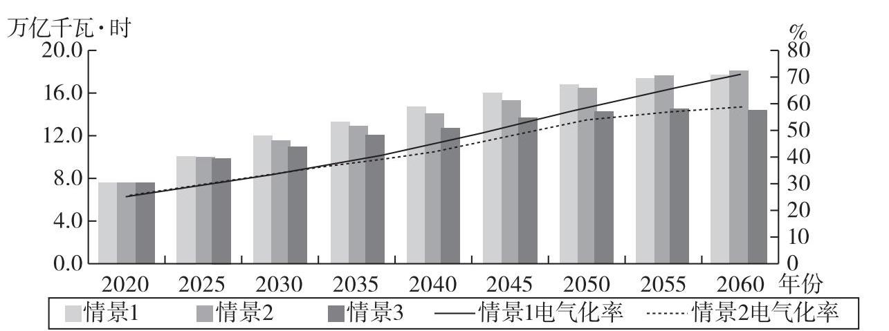 情景1:参考情景。一是提高能效,推动绿色生产生活方式,能源需求朝绿色低碳方向转型。统筹能源发展与安全,能源支撑国家“两步走”目标实现,建成社会主义现代化强国。二是节能低碳技术进步取得进展,CCS/CCUS