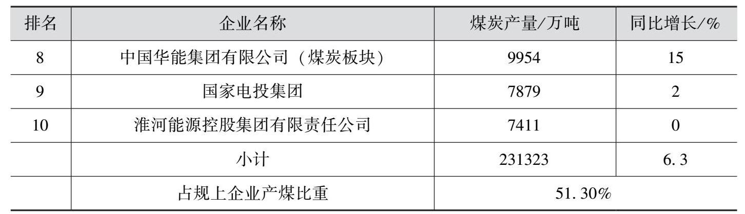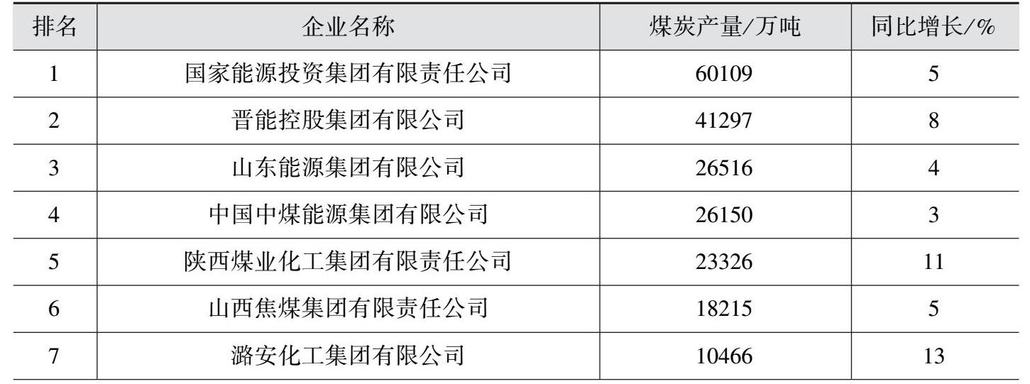 建立了以大集团和大煤矿为主导的建设格局。“十三五”以来,依托大型煤炭基地建设,全国煤炭供应强力保障国民经济稳步发展。随着山西、山东等地区大力推进煤炭企业兼并重组步伐,煤炭行业生产集中度也进一步提升。2020年,我国前4家煤炭企业为国家能源投资集团、晋能控股集团、新组建的山东能源集团和中煤能源集团,其各自煤炭年产量均在2亿吨以上,分别为5.3亿吨、3.1亿吨、2.7亿吨和2.2亿吨,合计产量为13.3亿吨,占全国煤炭总产量的34.1%。2022年,国有大型煤企的战略地位和重要作用越发凸显,原煤产量亿吨级企业扩大至7家,分别是国家能源投资集团、晋能控股集团、山东能源集团、中煤能源集团、陕西煤业化工集团、山西焦煤集团和潞安化工集团,七大亿吨级煤炭企业产量合计约20.6亿吨、同比增长6.4%,占全国煤炭总产量比重约45.8%,较上年提升2.7个百分点(见表1-5)。