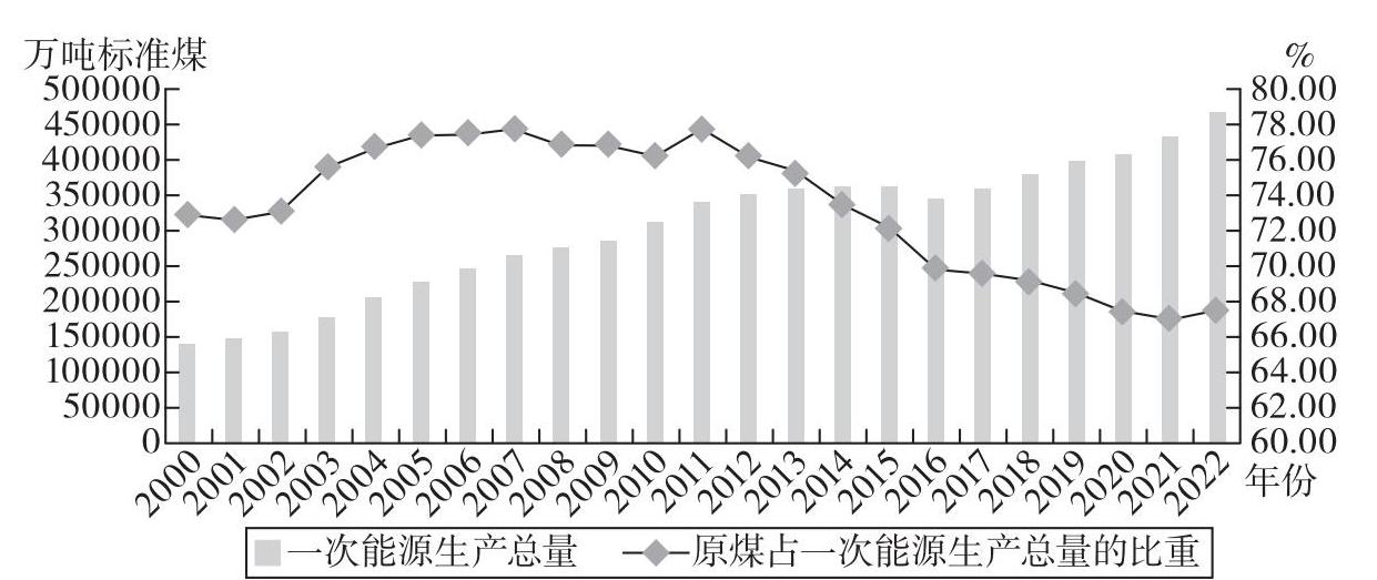图1-11 2000—2022年我国一次能源生产总量及煤炭占比情况