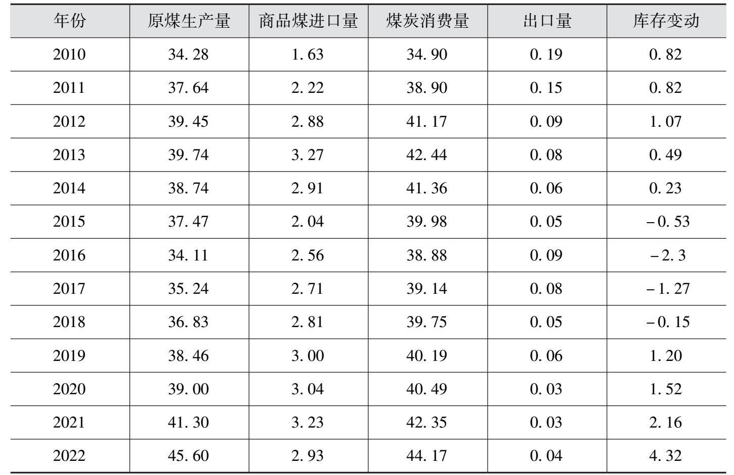 表1-10 2010—2022年我国煤炭供需情况 单位:亿吨