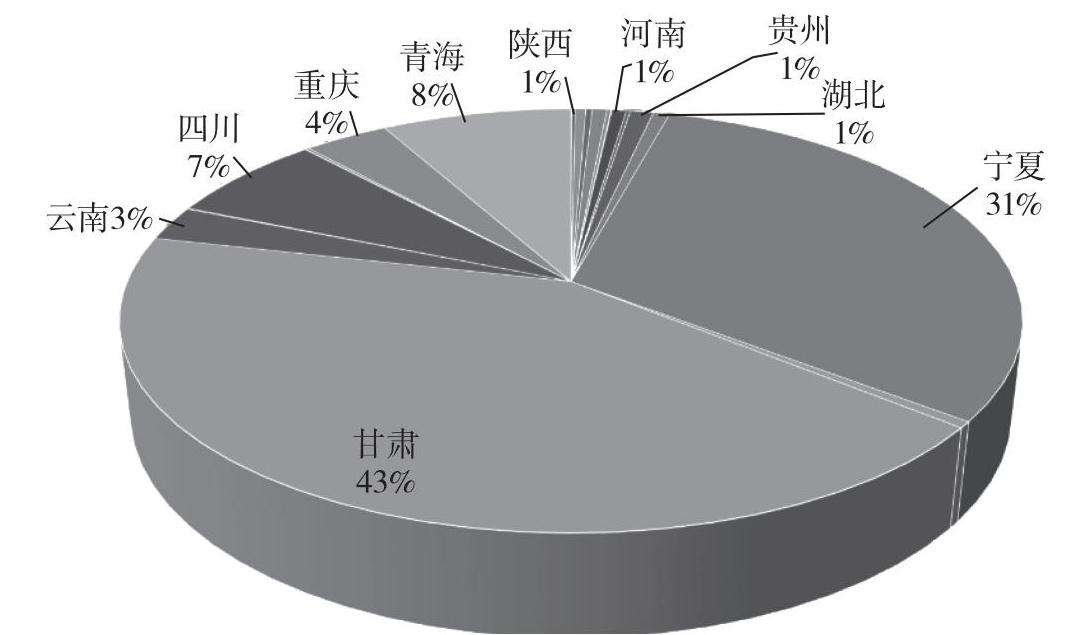 “十三五”以来,新疆煤炭资源开发进入加速阶段。2018年、2021年和2022年全区原煤产量相继突破2亿吨、3亿吨和4亿吨。作为全国第四大煤炭产区,新疆煤炭产能加速释放,积极缓解了相关省份能源供应偏紧形势。近年来,在全国煤炭供需整体处于紧平衡、煤价高位运行的大背景下,在巩固扩大甘肃、西南等传统外部市场占有率的基础上,积极开拓宁夏、青海、华中、华南等市场,并首次实现将煤炭通过京唐港等港口水运至东南沿海省份,煤炭销售覆盖全国29个省份,为保障国家能源安全做出了积极贡献。2022年,“疆煤外运”量实现翻倍,达到5493万吨。其中甘肃、宁夏、青海、四川、重庆和云南分别占43%、31%、8%、7%、4%和3%(见图1-12)。