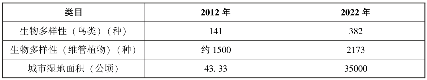 一座城市的生态文明建设是实现高质量发展的重要组成部分,与社会民生幸福息息相关。深圳经济特区从建立之初就一直强调经济与环境相协调、宜居与宜业相结合,从倡导绿色产业发展,到发布环保限制项目清单和划定基本生态控制线,再到开园护河打造绿色空间,深圳始终在积极探索先发地区可持续发展之路的最前线。在2012年至2022年的十年间,城市绿度建设保持高增速,“深圳绿”和“深圳蓝”成为特区的城市名片。表1为2012、2022年深圳市生态环境数据表(部分)。
