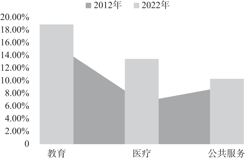 图2 2012、2022年深圳市民生支出占公共预算总支出的比例(部分)