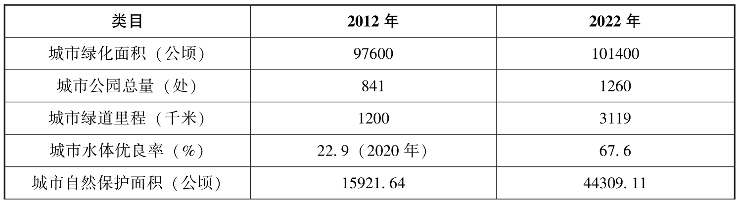 一座城市的生态文明建设是实现高质量发展的重要组成部分,与社会民生幸福息息相关。深圳经济特区从建立之初就一直强调经济与环境相协调、宜居与宜业相结合,从倡导绿色产业发展,到发布环保限制项目清单和划定基本生态控制线,再到开园护河打造绿色空间,深圳始终在积极探索先发地区可持续发展之路的最前线。在2012年至2022年的十年间,城市绿度建设保持高增速,“深圳绿”和“深圳蓝”成为特区的城市名片。表1为2012、2022年深圳市生态环境数据表(部分)。