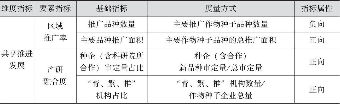 农作物种业共享推进发展维度指标用区域推广率和产研融合度表示,包含推广品种数量、主要品种推广面积、种企(含科研院所合作)审定量占比、“育、繁、推”机构占比四个基础指标。推广品种数量是体现农作物种子差异化的关键,推广品种数量多表示大多数种子性状无差异,不存在显著优点。单个品种推广面积越大则此品种普适性越突出,同时在农作物播种面积一定的条件下,单个品种推广面积直接代表种子的共享度。我国种业面临着产研分离的困境,科研院所以项目研究为导向、种业企业以市场为导向,二者间常常出现背离现象。在省审和国审的新品种中,申请主体是种业企业或种业企业与科研院所合作的数量越多,说明种业市场越趋于市场主导。只有以市场为主导,种业企业的活力才会被激发出来,种业高质量发展才能实现。“育、繁、推”机构数代表种业市场集中度,它是农作物种业高质量发展的重要指标。