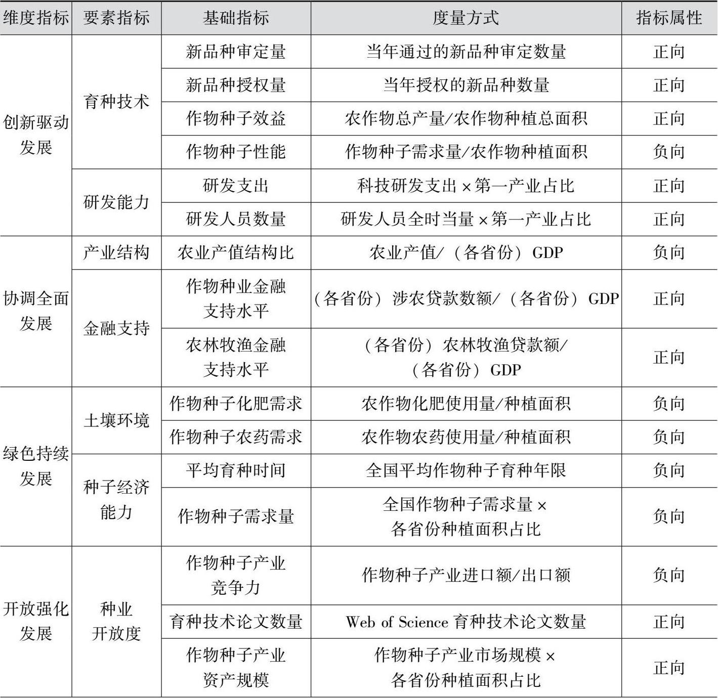 高质量发展是可持续的发展,是全面性、多维度的发展,是高效益、高品质的发展,高质量发展需涵盖创新、协调、绿色、开放、共享五个维度,农作物种业高质量发展的评价指标体系也要以此五个维度进行构建。基于农作物种业自身特性属于高科技含量、高附加值和高资本投入的高科技产业,且是农业基础性生产资料,在当前全球粮食安全的挑战下,农作物种业产业高质量发展评价指标体系构建要以可行性为前提,同时农作物种业高质量发展评价指标体系的构建应当在数据资料相关信息可获取的基础上进行。因此,在保障数据的可得性与真实性的前提下,构建起相对完善的评价指标体系是本书的难点与创新点。