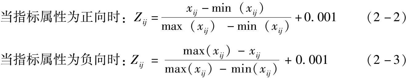 其中, Z ij 描述的是第 i 个子系统中的第 j 项指标的标准化值,max( x ij )、min( x ij )分别为某维度某项指标的最大值、最小值。