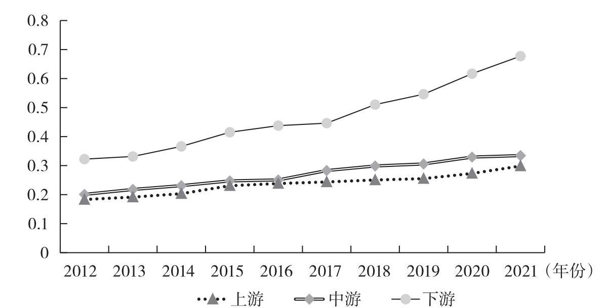 图2-7 2012—2021年黄河流域上、中、下游农作物种业高质量发展水平值