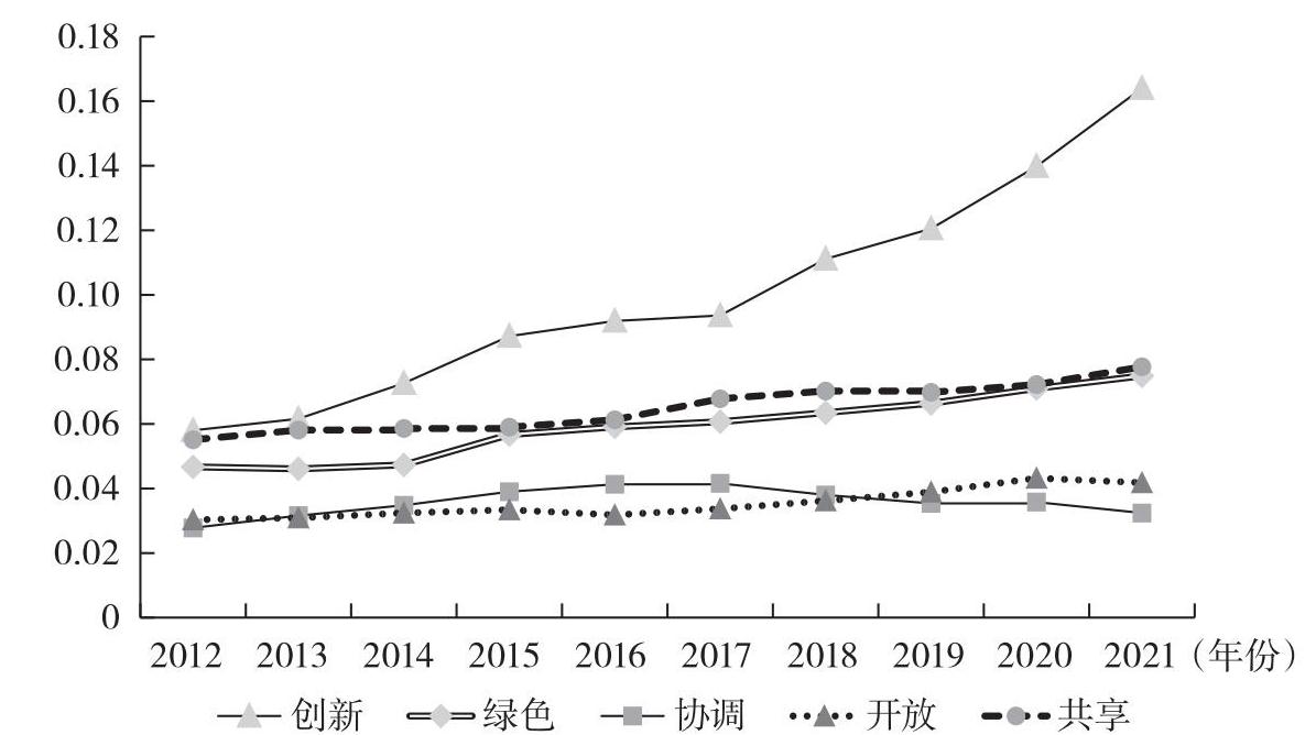 图2-6 2012—2021年黄河流域农作物种业高质量发展各维度水平变化趋势